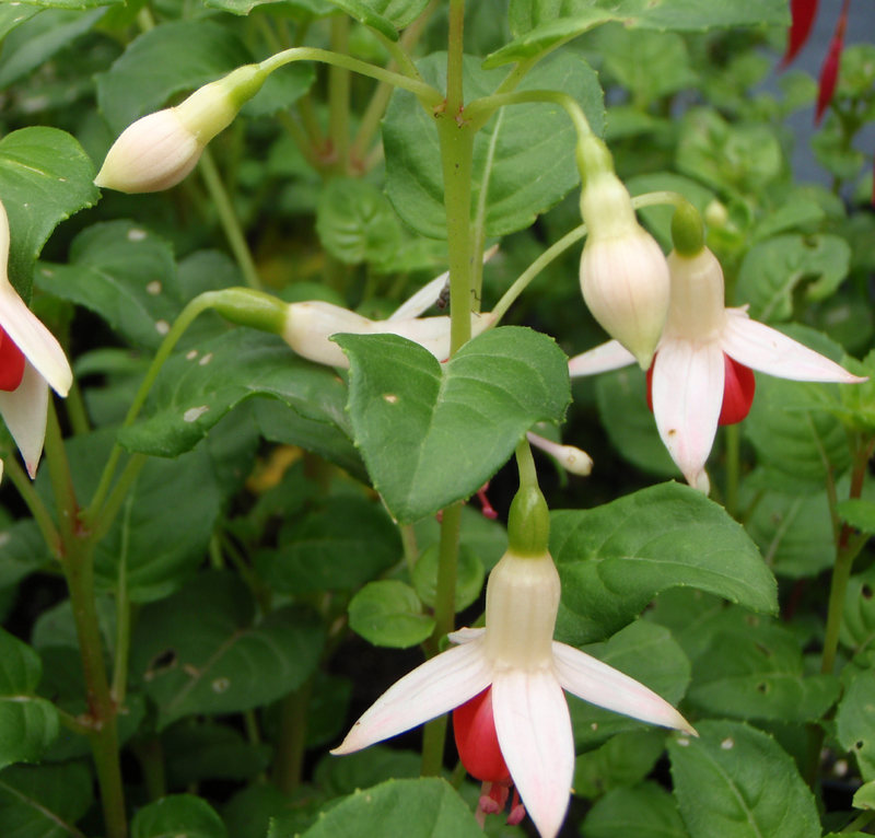 etwas niedriger bleibende Sorte mit weiß-rosa Blüten, die hier angebotenen Fuchsia magellanica sind mit leichter Abdeckung ausreichend winterhart, im Frühjahr Rückschnitt bis zum Boden, für locker-humose, nährstoffreiche Böden, blühen auch im vollen Schatten