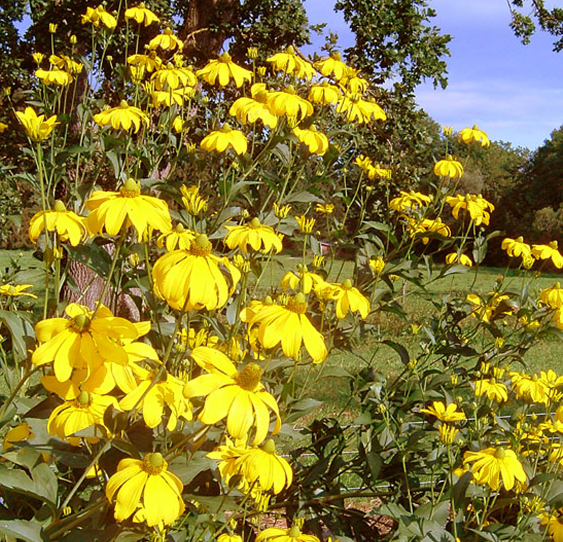 Hier haben wir die bekannte, hohe, aber sehr gut standfeste Art mit hängenden Blütenblättern und grüner Kegelmitte. Sie bildet auf lehmigen und nährstoffreichen Böden mit ihren kurzen Ausläufern große, straff aufrechte Horste.