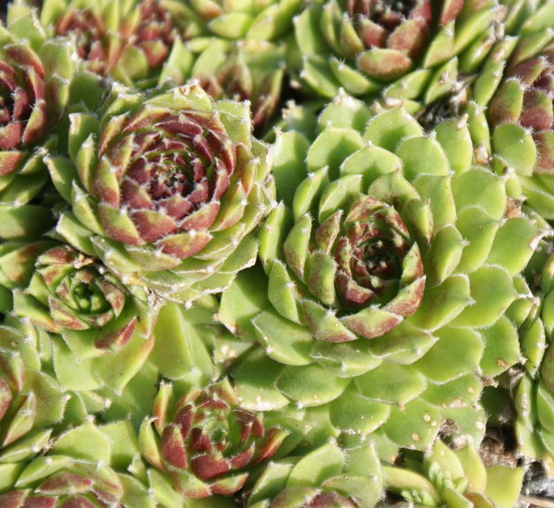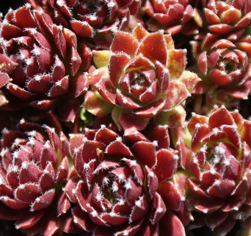 eine Spinnweb-Sorte mit mittelgroßen, grün mit roten, silbrig übersponnenen Rosetten, für trockene, magere Böden, wunderschön auch in Gefäßen