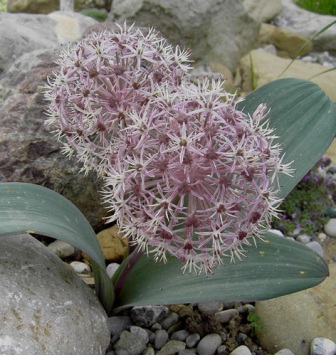 Allium karativiense, der Blauzungenlauch hat wunderschöne, metallisch blaugrüne Blätter und große Blütenkugeln, Blätter ziehen nach der Blüte ein, Samenstände bis in den Winter zierend, auch für Gestecke geeignet, sehr dauerhafter Zierlauch für durchlässige Böden, schön im Steingarten