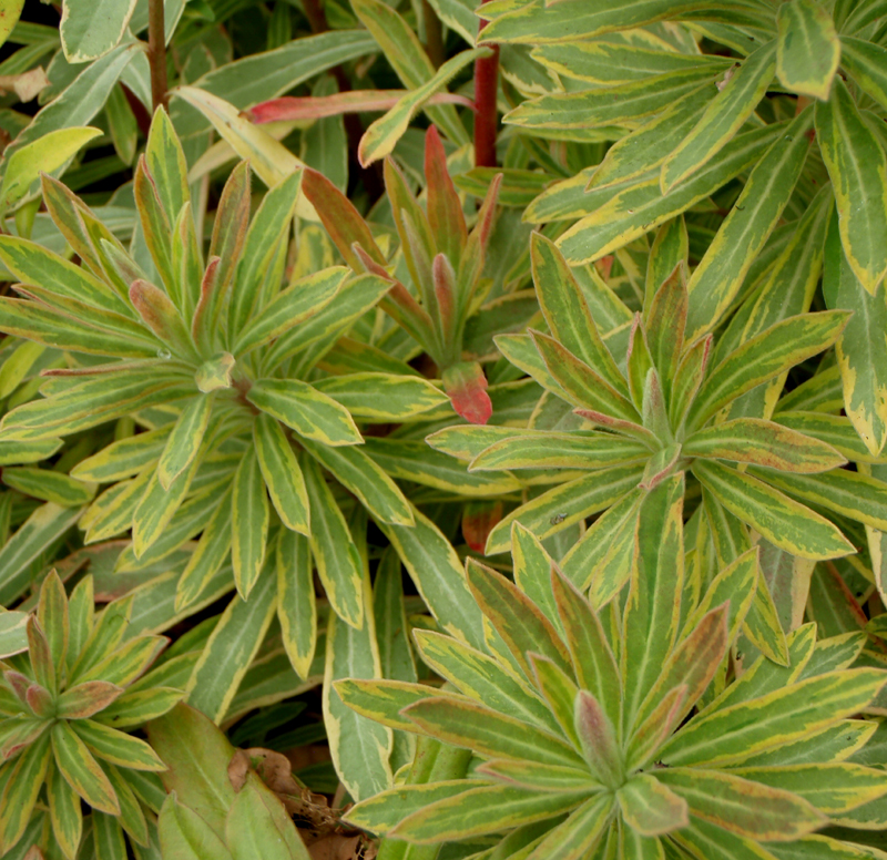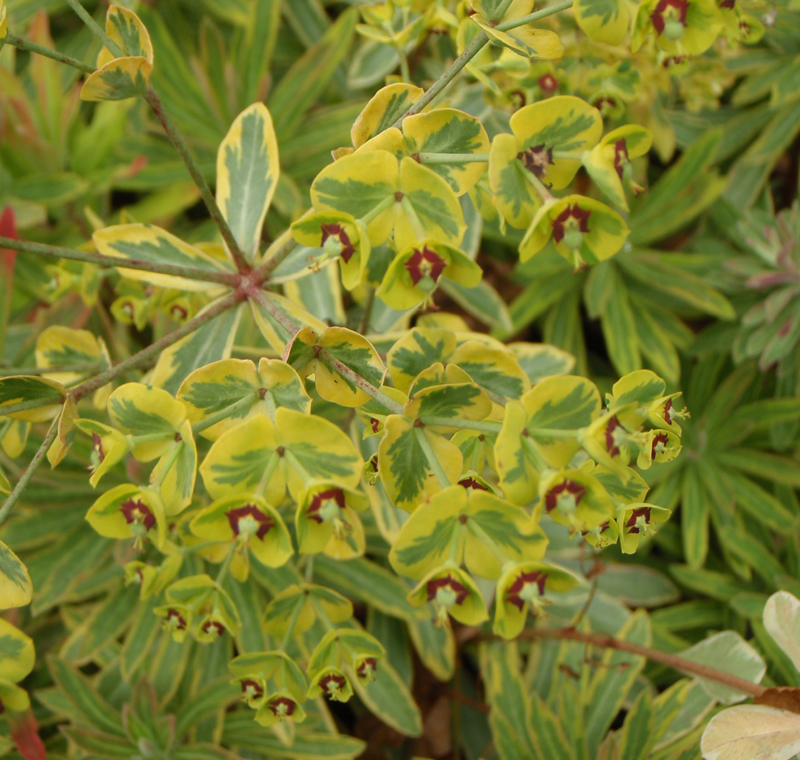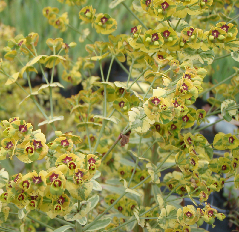 Bunte Mittelmeer-Wolfsmilch / auffällige Blattschmuckstaude mit gelb, grün, rosa panaschiertem Laub und schönen Samenständen, Winterschutz empfehlenswert, für durchlässige, mäßig nährstoffreiche Böden