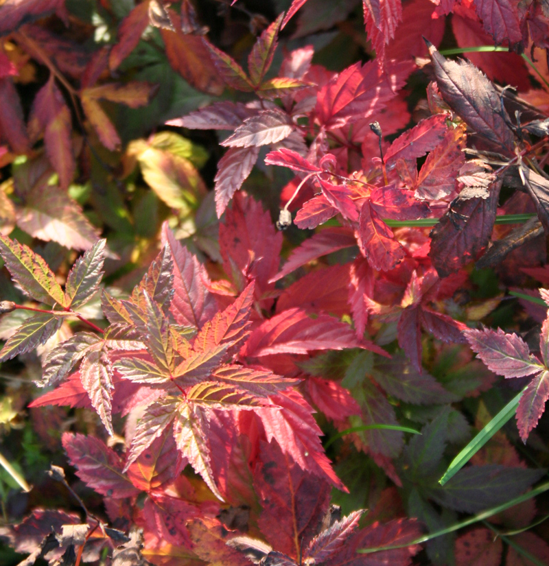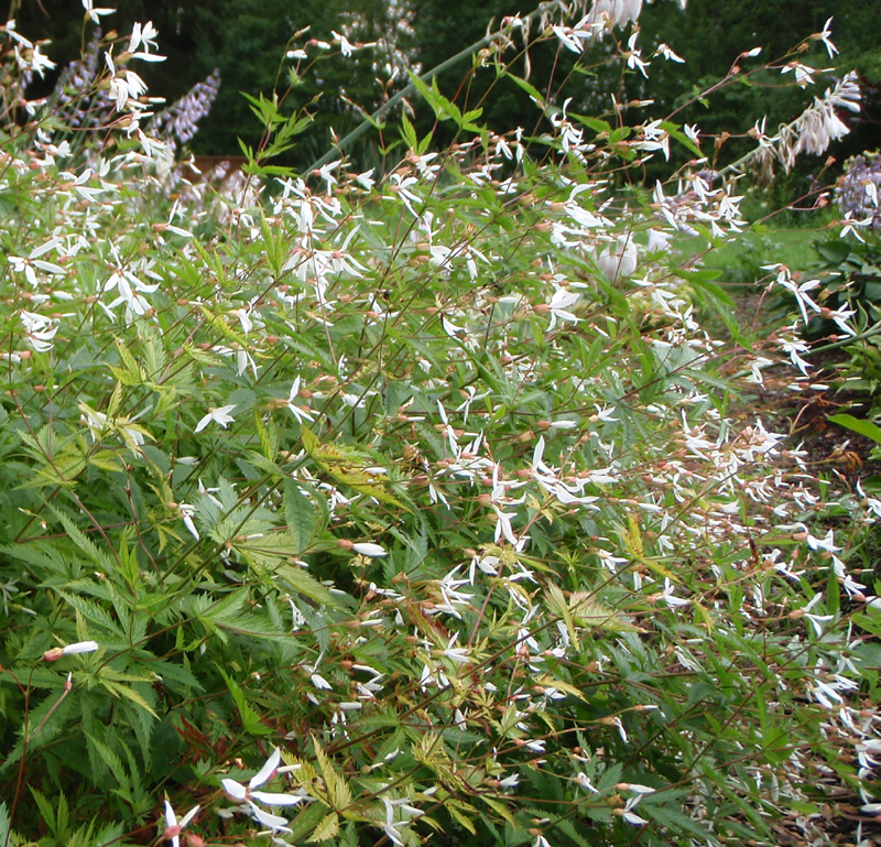 Diese robuste Staude ist noch zu wenig verwendet. Buschig-aufrecht wachsend mit feinen schneeweißen Blütenrispen und grazilen, dreiteiligen Blättern, braucht etwas Zeit um einzuwachsen, spektakuläre, orange Herbstfärbung, für kalkarme, humose, lockere Böden gedeiht gut in der Sonne oder im Schatten