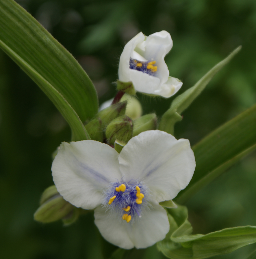 Neben Iris Prichard hat auch die Sorte Osprey weiße Blüten mit auffallend violettblauen Staubfäden.Tradescantien sind robust und langlebig und bevorzugen frische, nährstoffreiche Böden, schön am Teichrand, ein Rückschnitt nach der Blüte fördert die Nachblüte und verhindert zu starke Selbstaussaat.