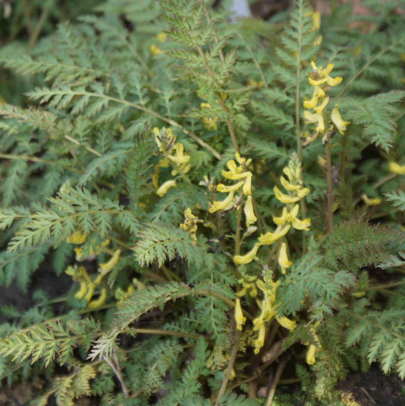 sehr anpassungsfähiger, wintergrüner Lerchensporn mit farnartigem Laub, leuchtend gelbe, aufrechte Blüten, versamt sich gut auf frischen, steinig-lehmigen Böden