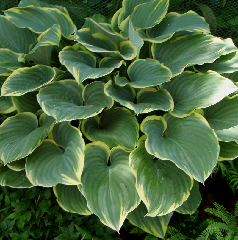 Sehr elegante große Hosta mit dicken, herzförmigen, am Rand gewellten Blättern, blaugrau mit cremegelbem Rand, wächst langsam