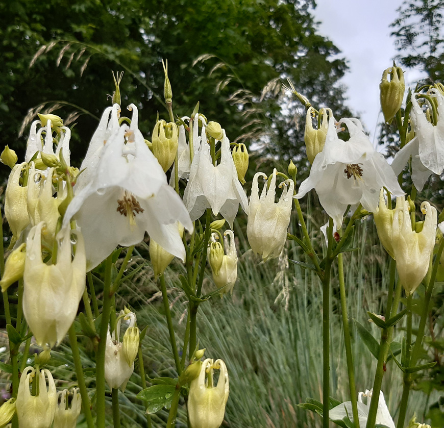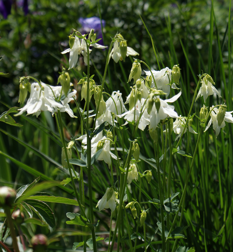 weiße Auslese der heimischen Akelei, generativ vermehrt, Blüten leuchten im Schattengarten, sehr pflegeleicht und anpassungsfähig