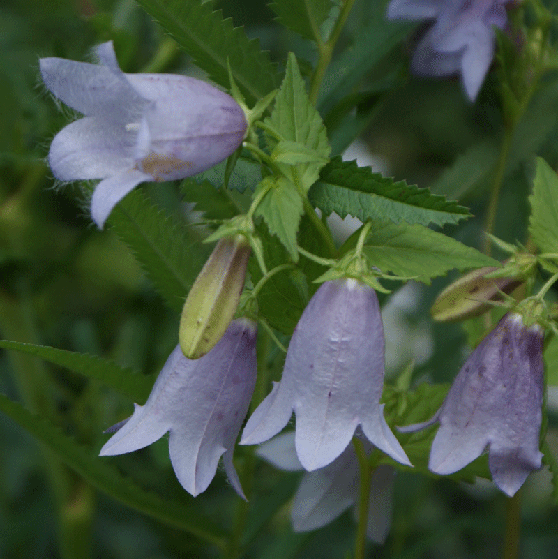 Blütenreiche, buschig wachsende Hybride aus Campanula punctata und Symphandra ossetica, enorm lange Blütezeit