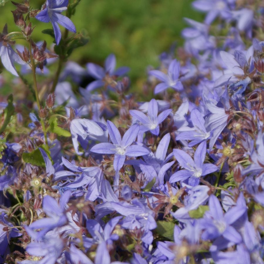 wüchsige, niedrige Glockenblume mit langen Blütenranken, blüht nach Rückschnitt ein zweites Mal, sehr anpassungsfähig