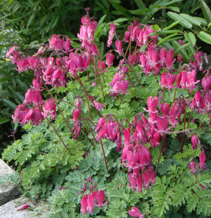 Zwerg-Herzblume, graugrüne, farnartige Blätter und kleine Herzerl-Blüten in bogigen Trauben, enorm lange Blütezeit, zieht nicht ein, für eher kalkarme, humose Böden, aber recht anpassungsfähig