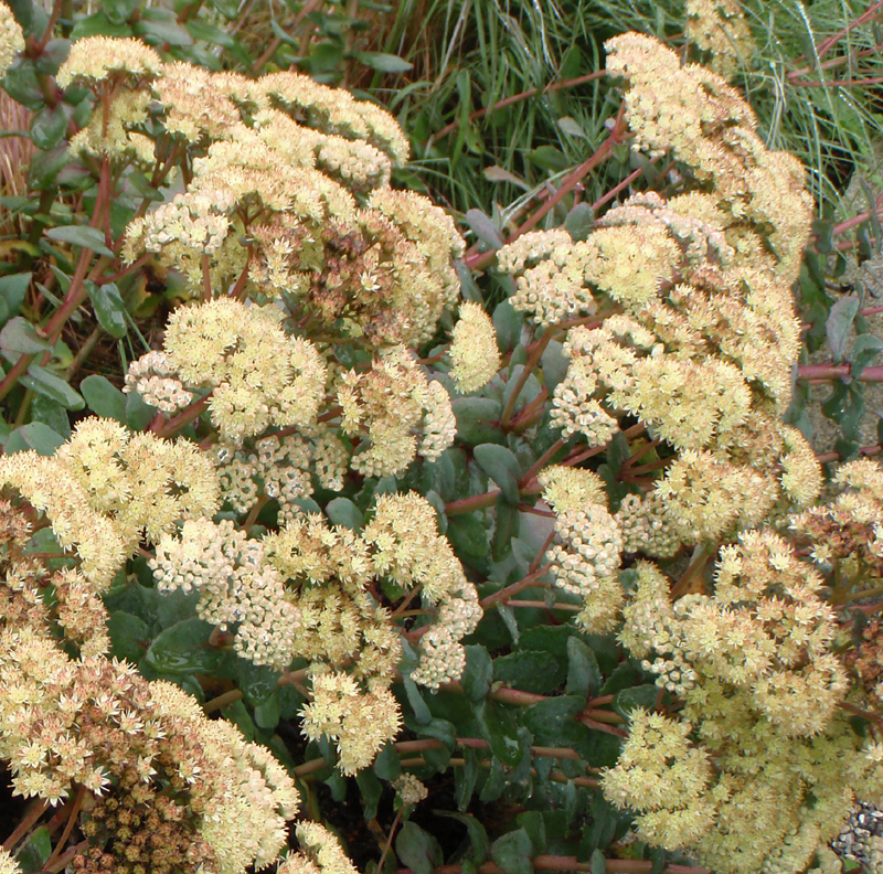 Heimische Unterart von Sedum telephium mit gelblichen Blüten, wichtige Bienenweide, für eher trockene, nährstoffarme Böden in sonnigen Beeten
