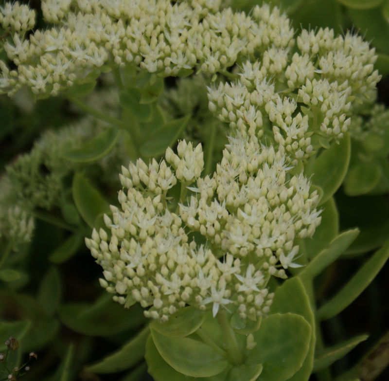 Weißblühende Sorte der hohen Fetthenne mit auffallend hellgrünem Laub. Kann bisweilen rosablühende Triebe hervorbringen die man einfach ausbrechen kann. Robuste gute Bienenweide für den Spätsommer.