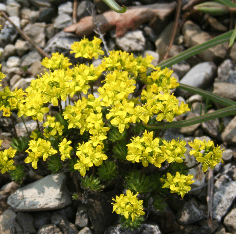 Immergrünes Felsenblümchen / heimische Wildstaude mit zwergig wachsenden, immergrünen Polstern und früher gelber Blüte, für sandige, durchlässige Plätze im Steingarten oder in Trockenmauern