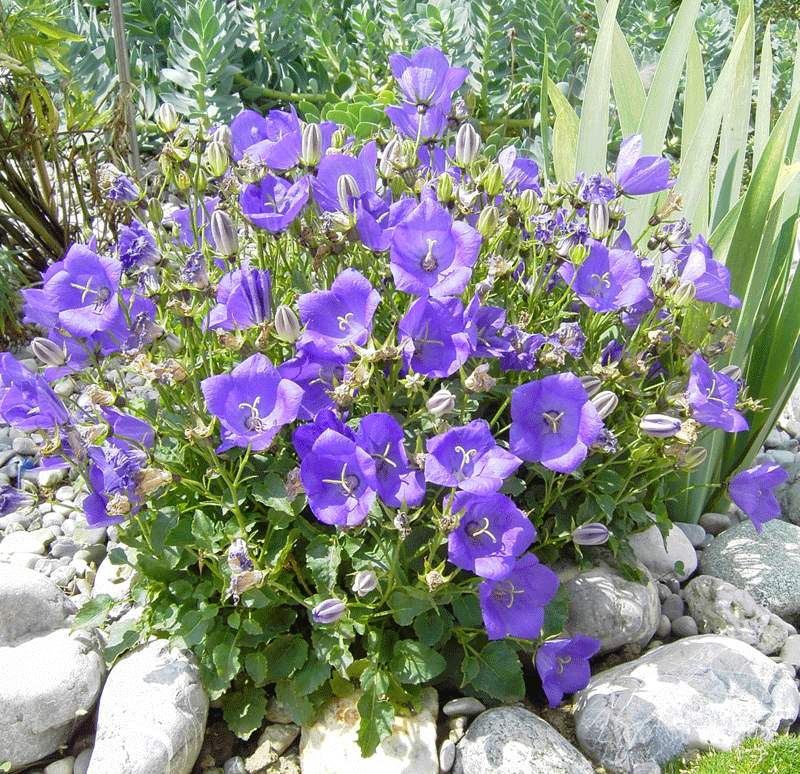 Niedrige Polsterglockenblume mit sehr großen, weit geöffneten Schalenblüten, für Steingärten und Tröge