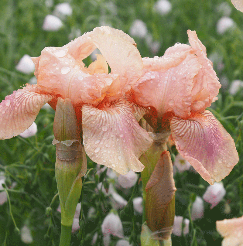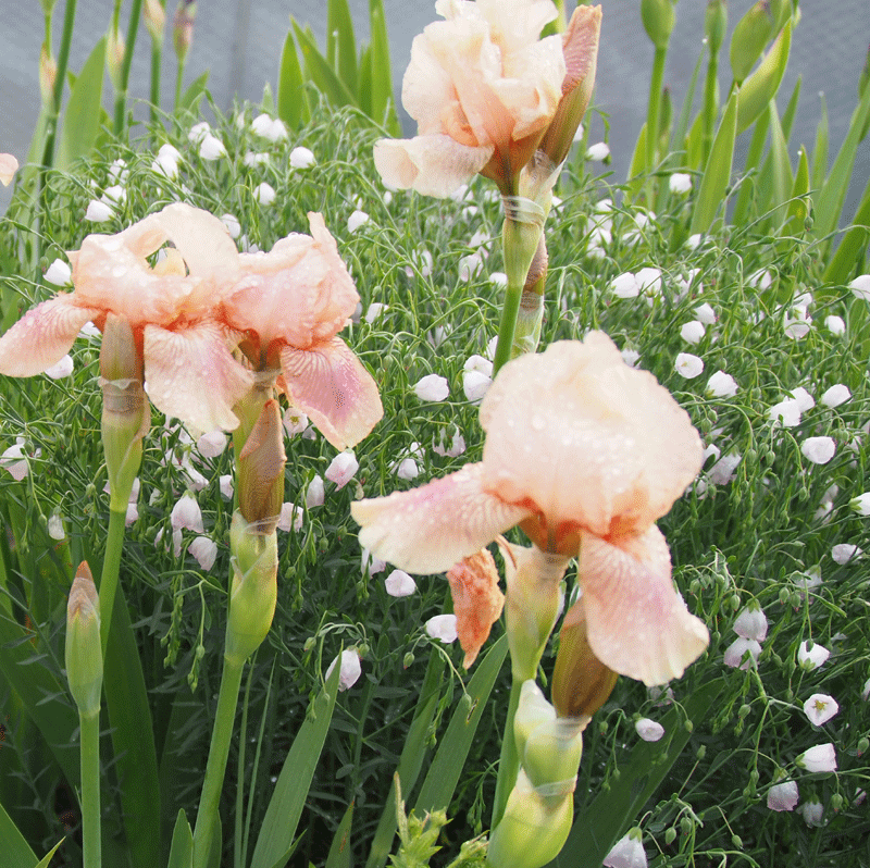 orangerosa blühende Bartiris, prachtvolle Blütenstauden mit schwertförmigem Laub, so pflanzen, dass das Rhyzom ca. ein Drittel aus der Erde ragt, für durchlässige, relativ nährstoffreiche (nur mäßig Stickstoff) Böden