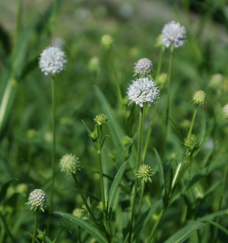 Succisella inflexa ist eine buschig und reich verzweigt wachsende Staude mit perlmuttfarbenen Blütenknöpfen und sehr langer Blütezeit, für frische bis feuchte, gerne wechselfeuchte, eher kalkarme Böden.