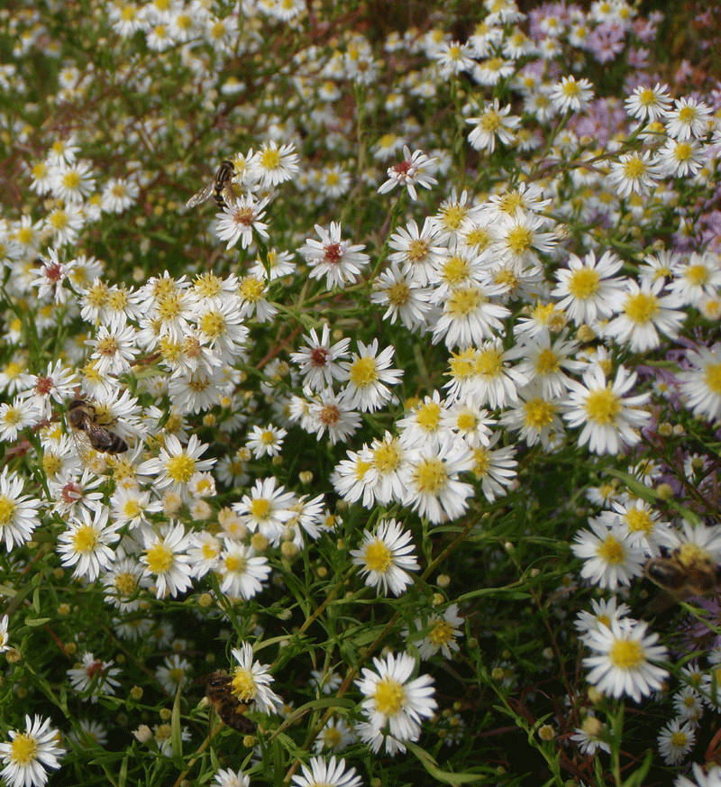Septemberkraut, eine Vielzahl an kleinen, weißen Blüten, super zu Schnitt, dankbar und robust, kommt auch mit Trockenheit gut zurecht, die Sorte Schneegitter bildet Ausläufer und beansprucht viel Platz