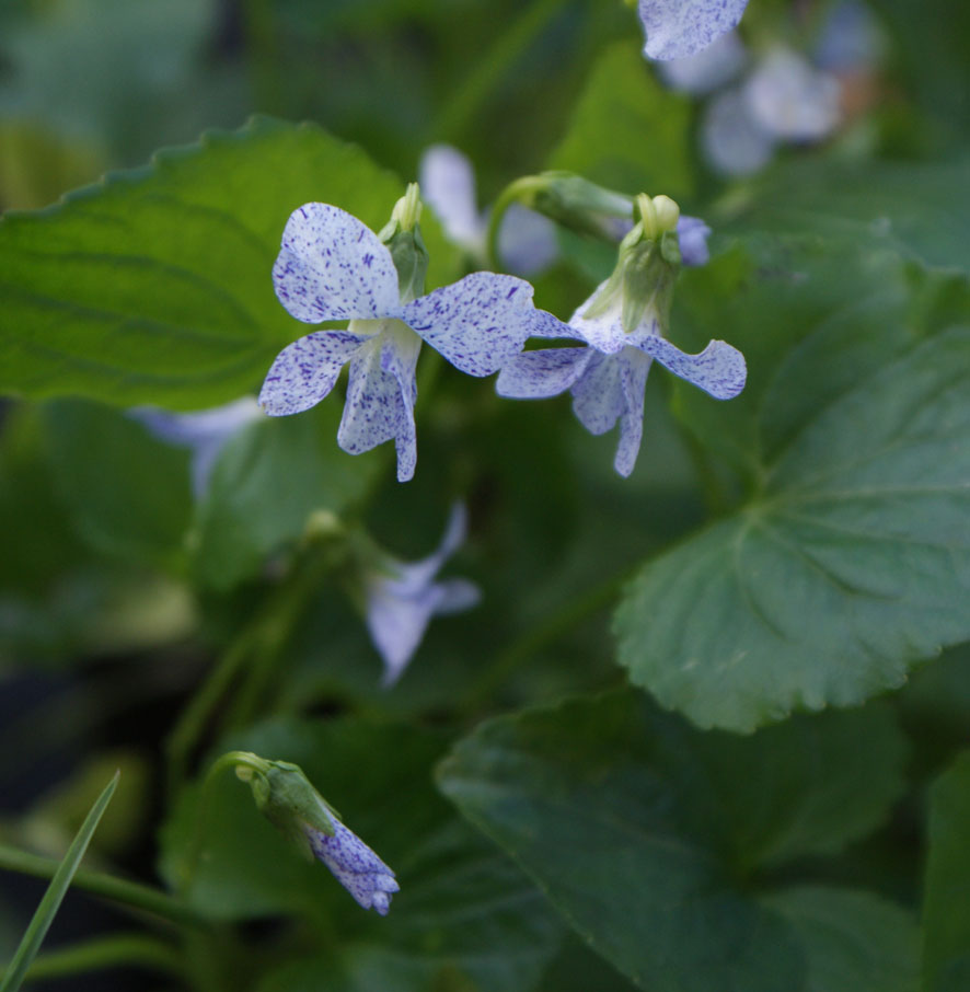 Das Pfingst-Veilchen ist eine wüchsige, robuste Staude, die sich durch kurze Rhyzome und Selbstaussaat allmählich flächendeckend ausbreitet, Viola sororia Freckles hat lustig lilafarben gesprenkelte weiße Blüten, die winterharte Staude ist als Bodendecker für kleine Flächen geeignet und stellt keine besonderen Ansprüche an den Boden