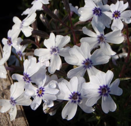 niedlicher Phlox in den bayerischen Nationalfarben, weiß mit blauem Auge, niedrige, reichblütige Art für Steingärten und Mauern, braucht ab und zu einen kräftigen Rückschnitt, für gut durchlässige, kies- oder schotterreiche, lehmige Böden in vollsonniger Lage, immergrün