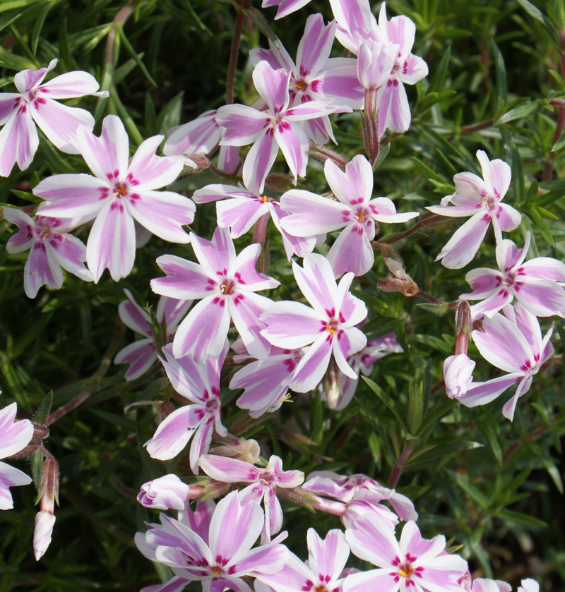 Lustige, einzigartige, rosa-weiß gestreifte Blüten, niedrige, reichblütige Art für Steingärten und Mauern, braucht ab und zu einen kräftigen Rückschnitt, für gut durchlässige, kies- oder schotterreiche, lehmige Böden in sonnigen Lagen, schön auch in Töpfen und Trögen, immergrünes Polster
