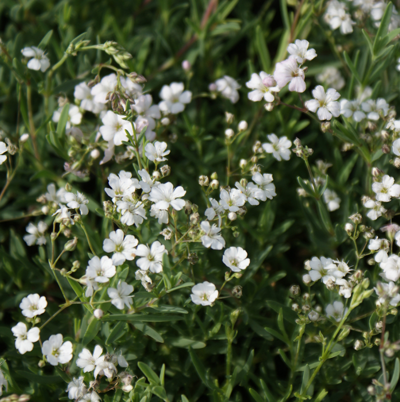 Gipskraut, Kriechendes Schleierkraut / heimische Wildstaude mit immergrünen, nadeligen Blättern und duftigen Blütchen, bildet lockere, kriechende Polster, für durchlässige, nicht zu trockene, Stein– und Kiesböden