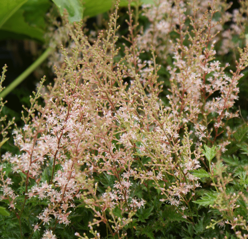 Kleine Prachtspiere mit besonders schönem, bronzegrünem Laub und filigranen, überhängenden Rispen, für frische, lehmig-humose, gerne auch saure Böden im Halbschatten