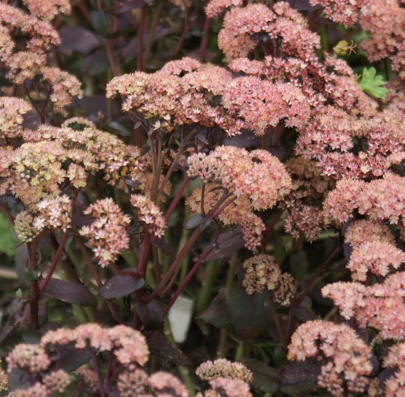 Lachsrosa Blütendolden kombiniert mit bronzebraune Blättern. Obwohl diese Sorte eine der ältesten dunkellaubigen Sorten ist, ist sie immer noch eine der Besten und Robustesten. für durchlässige, eher nährstoffarme Böden in sonnigen Beeten