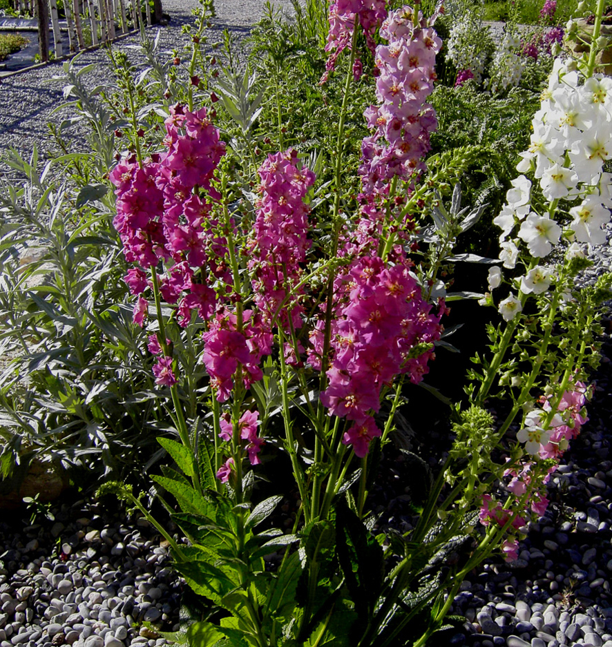 Verbascum phoeniceum ist eine weitere ausdauernde, heimische Königskerze, sie bleibt niedriger und erfreut über einen langen Zeitraum mit rosa, violetten oder weißen Blütenkerzen, auch zahlreiche Insekten lieben die Purpur-Königskerze. Verbasum phoeniceum ist sehr anpassungsfähig und sät sich auch oft in Plattenfugen oder Kiesflächen.
