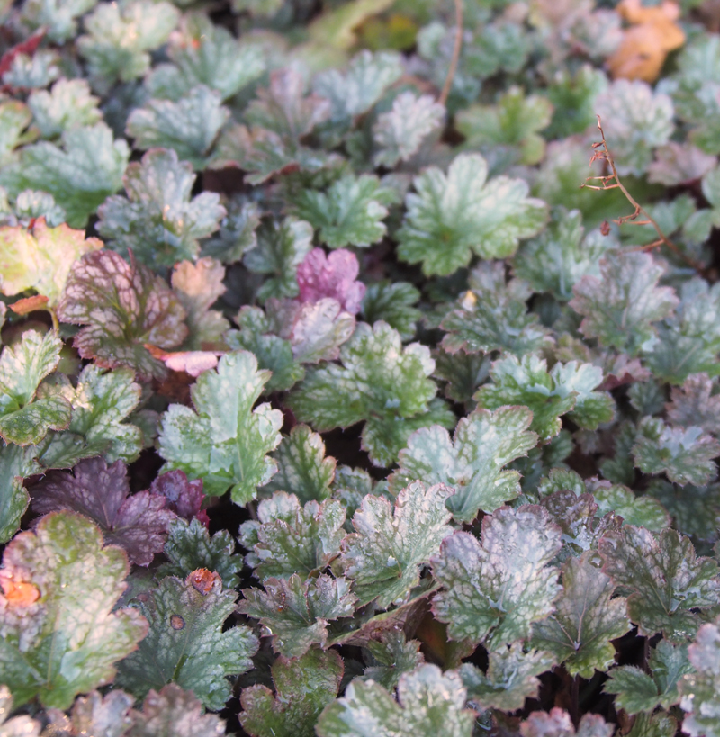 besonders niedrige Sorte mit rotviolettem Laub und silberner Zeichnung, nicht zu schattig pflanzen