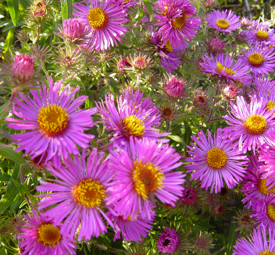 Raublatt-Aster / Typische Bauerngartenstaude, buschig wachsend, Stütze kann nicht schaden, schließen oft bei schlechtem Wetter die Blüten, kein Befall mit Mehltau, für sehr nährstoffreiche, lehmig-humose Böden