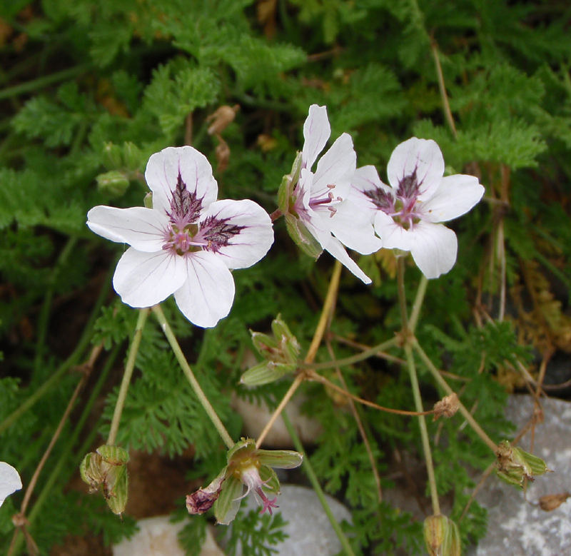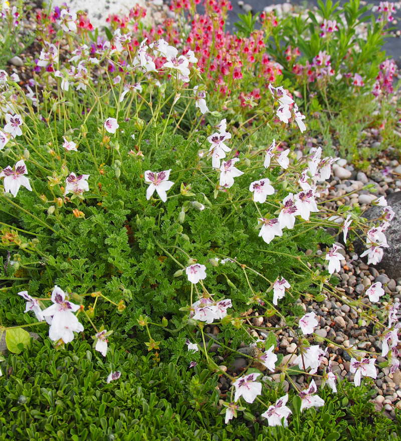 Zierlicher Dauerblüher mit sehr attraktivem, feingliedrigen Laub und weißen Blüten mit weinroten Augen, sehr hübsch und vor allem langeblühend, für durchlässige Böden in Stein- und Kiesgärten