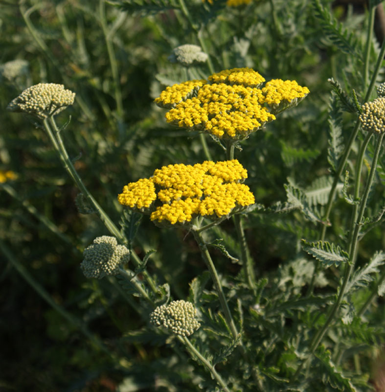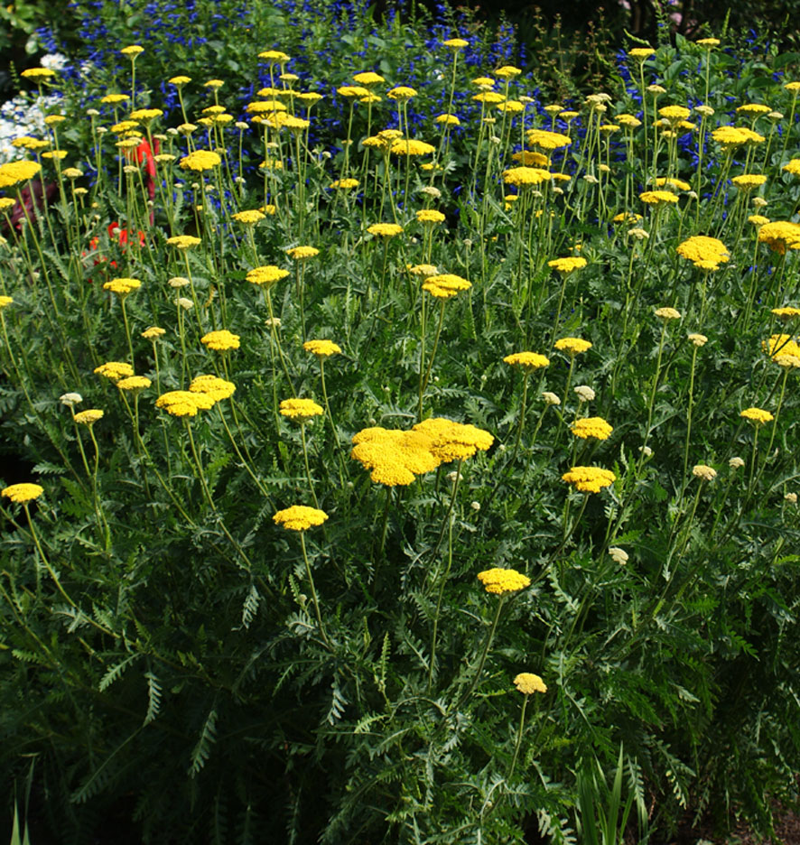 Coronation Gold ist eine alte, bewährte Sorte mit besonders kompaktem Wuchs und leuchtender Blütenfarbe, sie ist auch als Trockenblume geeignet und blüht nach Rückschnitt ein zweites Mal. Schafgarben (Achillea filipendulina) sind weit verbreitete Stauden mit schirmförmigen Blütendolden und fein gefiedertem, aromatisch duftendem Laub, für durchlässige, relativ nährstoffreiche Böden, nach 2-3 Jahren sollten sie aufgenommen und geteilt werden