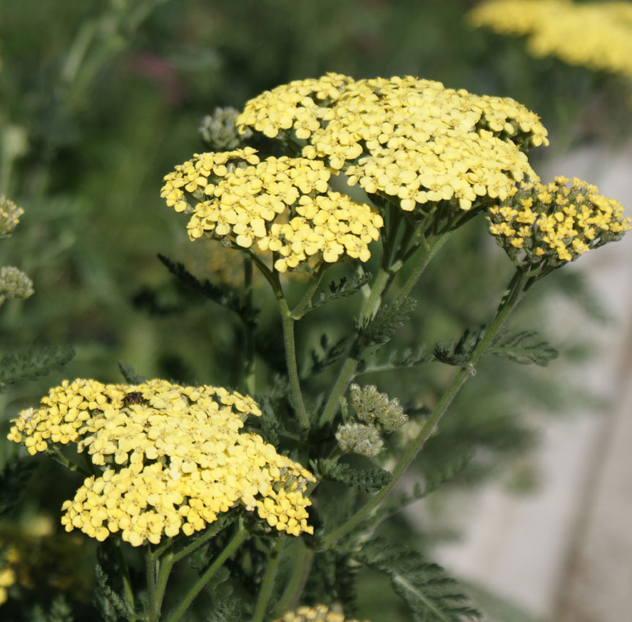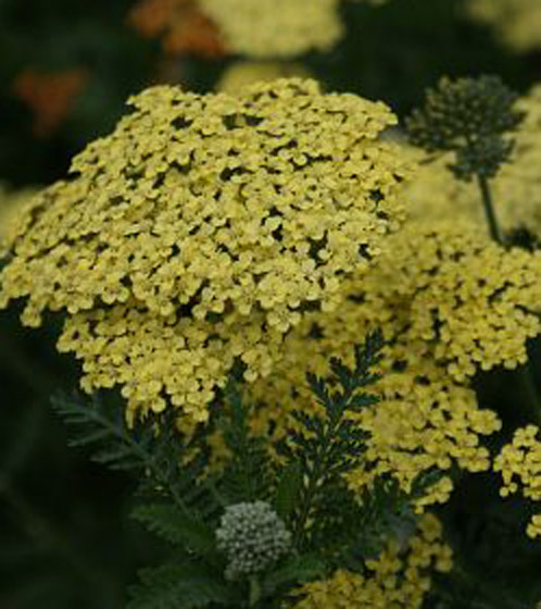 Die großen, hellgelben Blüten der Sorte Credo verblühen zu einem zarten Creme und lassen sich besonders schön mit Violetttönen kombinieren, die Sorte ist sehr standfest und robust. Schafgarben (Achillea filipendulina) sind weit verbreitete, sehr standfeste Stauden mit schirmförmigen Blütendolden und fein gefiedertem, aromatisch duftendem Laub, auch als Trockenblume geeignet, blühen nach Rückschnitt ein zweites Mal, für durchlässige, relativ nährstoffreiche Böden