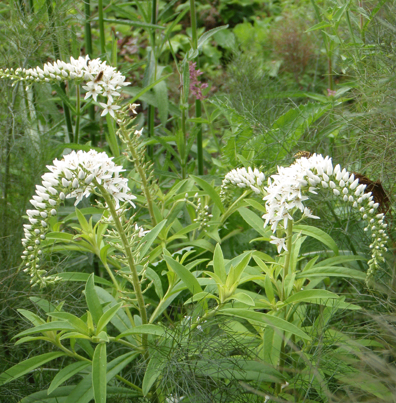 elegante Staude mit langen, geschwungenen Blütentrauben, kurze Ausläufer, spektakuläre, rote Herbstfärbung, für frische, humose Böden