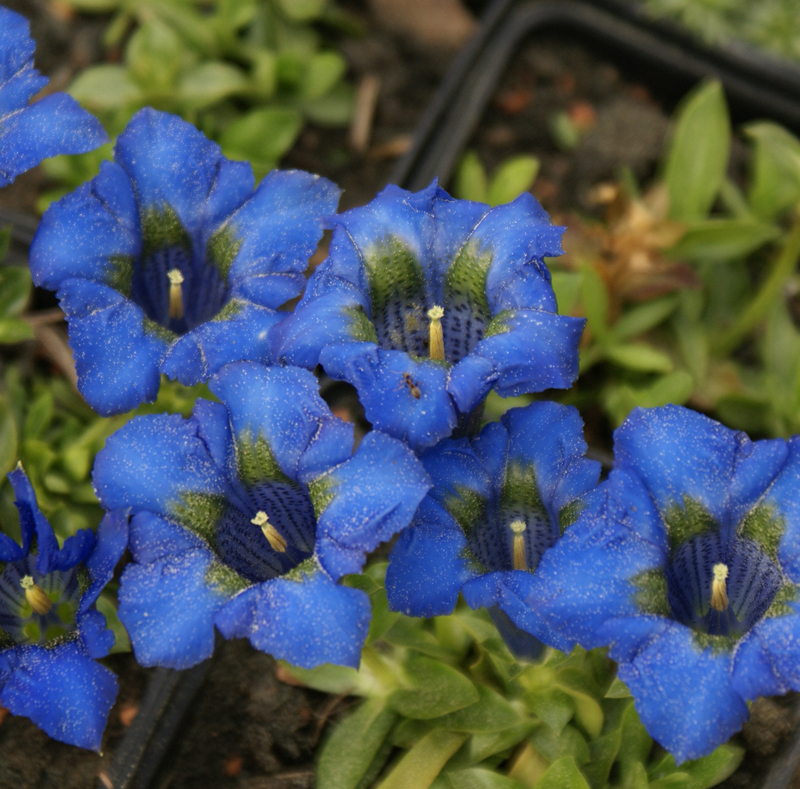 Stängelloser Silikat-Enzian / heimische Wildart der Silikat-alpen, blüht im Herbst oft nach, große blaue Trichterblüten mit 5 grünen Basalflecken, für durchlässige, steinig-lehmige, kalkarme bis kalkfreie Böden