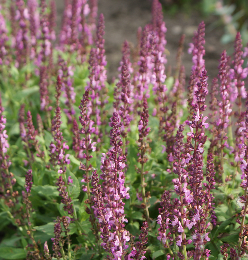 rosa blühende Auslese des heimischen Steppensalbei mit buschigem Wuchs und straff aufrechten Blütenkerzen, nach Rückschnitt erfolgt zweite Blüte, für durchlässige, mäßig nährstoffreiche Böden