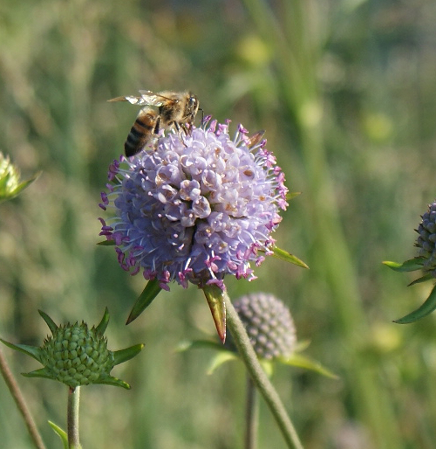 Succisa pratensis Nana ist eine kompakte und daher etwas früher blühende Form mit schmallanzettlichen Blättern für eher etwas feuchtere Standorte. Unsere Mutterpflanze hatte ich bei meinem Standnachbarn auf dem Gartenmarkt in Tüssling Jürgen Peters erstanden.