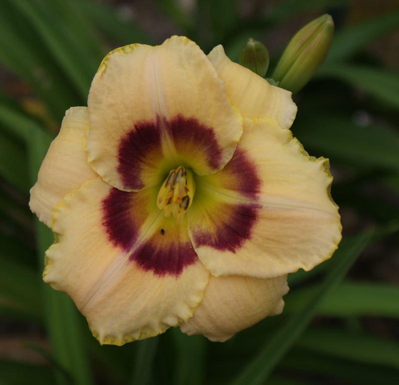 mehrfach ausgezeichnete Sorte in cremegelb, mit rotbraunem Ring und grünem Schlund, sehr langlebige Stauden, die Einzelblüten blühen jeweils nur einen Tag und sind als essbare Schönheiten super als Salatdeko geeignet, für humose, lehmige, nährstoffreiche Böden