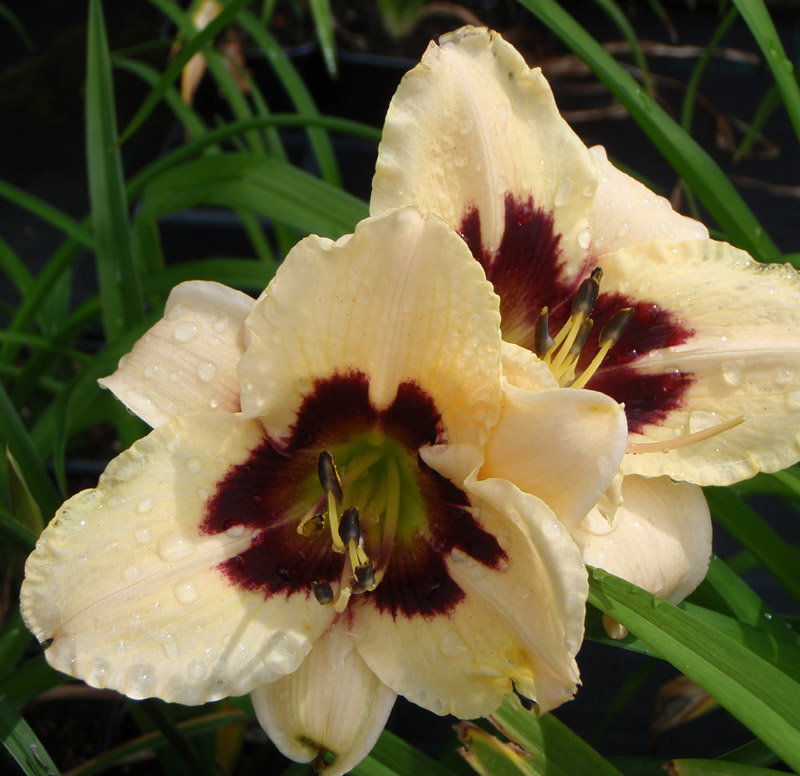 weiße Blüte mit dunklem Schlund, gewellter Rand, sehr geheimnisvoll und besonders, langlebige Stauden, die Einzelblüten blühen jeweils nur einen Tag, für humose, lehmige, nährstoffreiche Böden