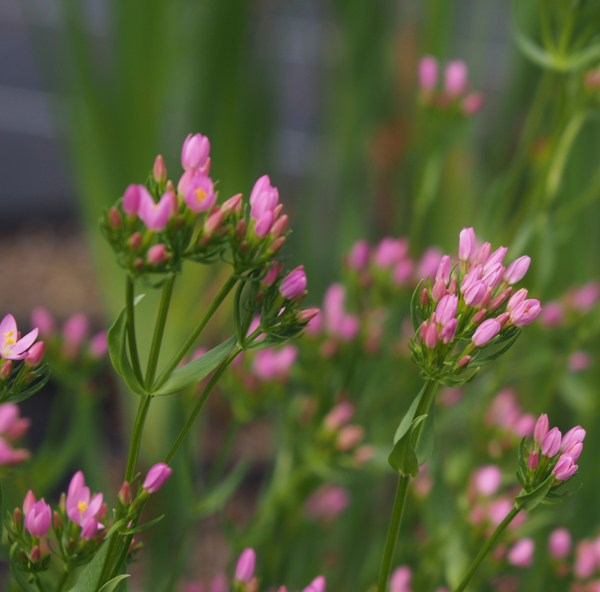 Das hübsche kleine Enziangewächs kommt in der Natur auf frischen Wiesen und Waldlichtungen vor, im Garten ist es sehr anpassungsfähig und verträgt auch Trockenheit. Eine Heilpflanze, deren getrocknete, oberirdische Pflanzenteile als Magenbitter verwendet werden können. Das zweijährige, zarte, rosablühende Blümchen mit gelben Staubfäden hat eine dunkelgrüne grundständige Blattrosette an der die Blütenstängel ca. 20-30 cm hoch werden. Centaurium erythraea (Tausendgüldenkraut) bevorzugt einen sonnig bis halbschattigen Standort und trockenen bis frischen Boden. Sie ist nicht sehr konkurenzstark. An zusagenden Stellen mit offenen Boden erhält sie sich durch Selbstaussaat.