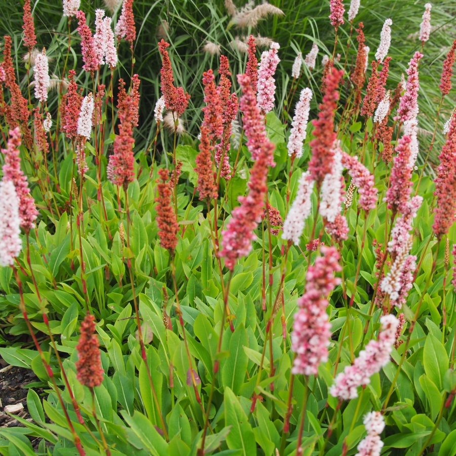 Teppich-Knöterich, alt: Bistorta affine / bildet dichte, immergrüne Laubteppiche, tolle rostrote Winterfarbe, Blüten wechseln von dunkel– auf hellrosa im aufblühen, für lehmig-humose, frische Böden in sonnigen bis halbschattigen Bereichen im Garten
