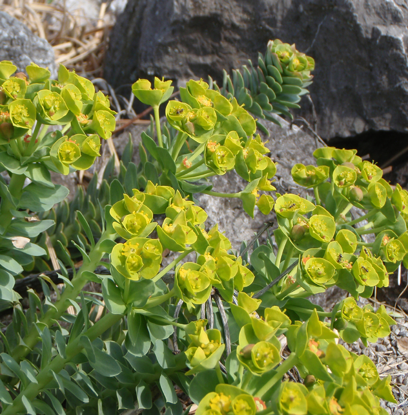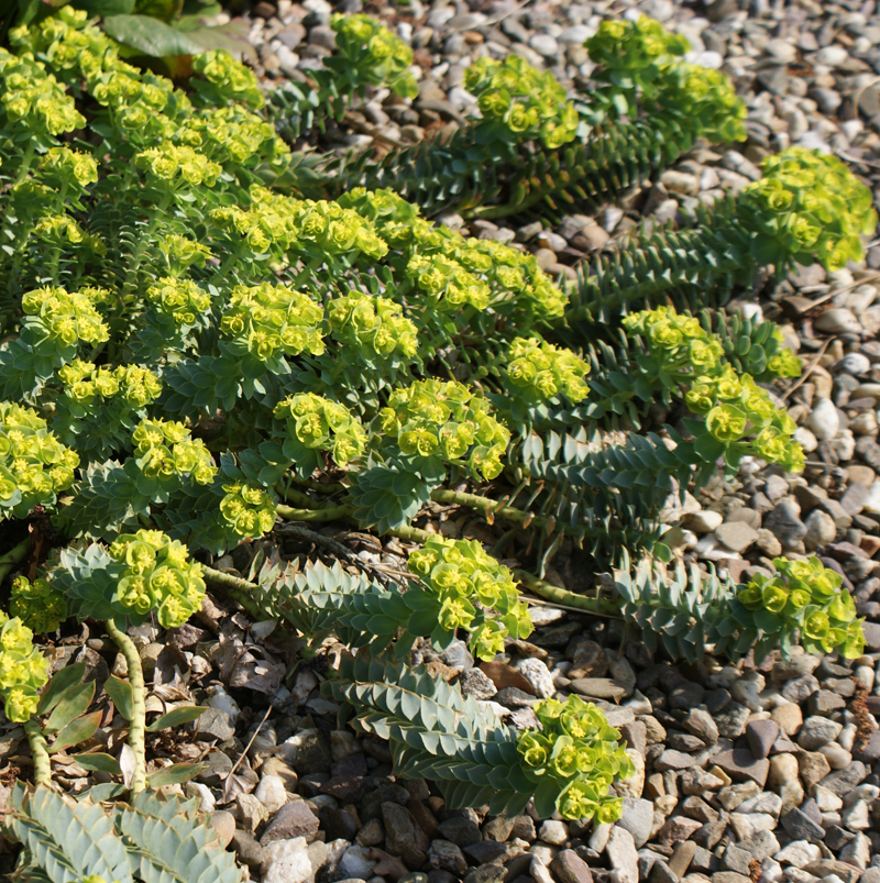 Walzen-Wolfsmilch / urtümlich wirkende Art mit langen, walzenförmigen, nieder liegenden Trieben, silbergraue, wintergrüne Blätter, für feinschottrige, kalkhaltige Böden