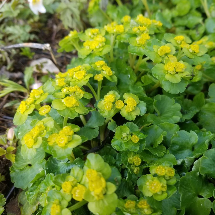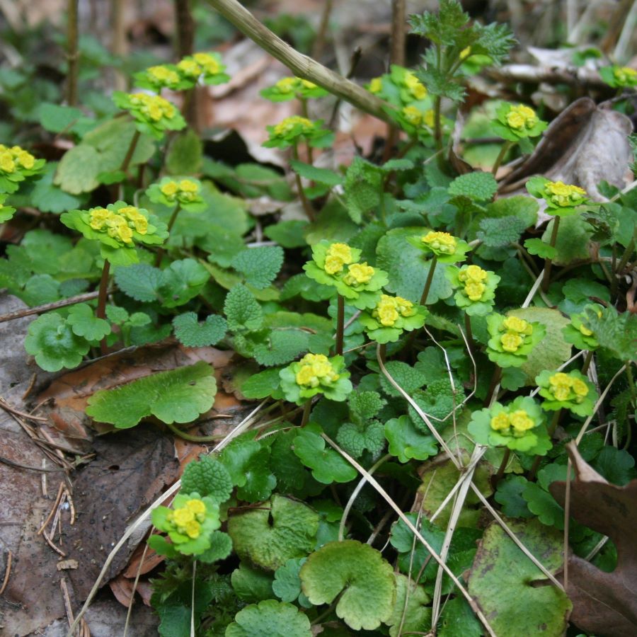 Heimische Waldstaude mit außergewöhnlichen gelbgrünen Blüten, die an eine Euphorbia erinnern, bildet dichte Teppiche, für frische bis feuchte Böden unter Gehölzen