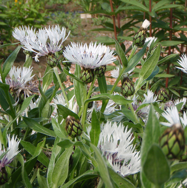 Eine weiße Sorte der heimischen Wildart mit silbrigem Laub. Die großen, kornblumenartigen Blütenköpfe blühen schon ab Mai bis in den Sommer. Ein Rückschnitt nach der Blüte verhindert Selbstaussaat und führt oft zu einer Nachblüte. Über einen frischen, humusreichen Boden in sonniger bis halbschattiger Lage freuen sich die anspruchslosen Pflanzen. Sie sind auch sehr tolerant Trockenheit gegenüber und somit sehr robust und für fast jeden Gartentyp geeignet.