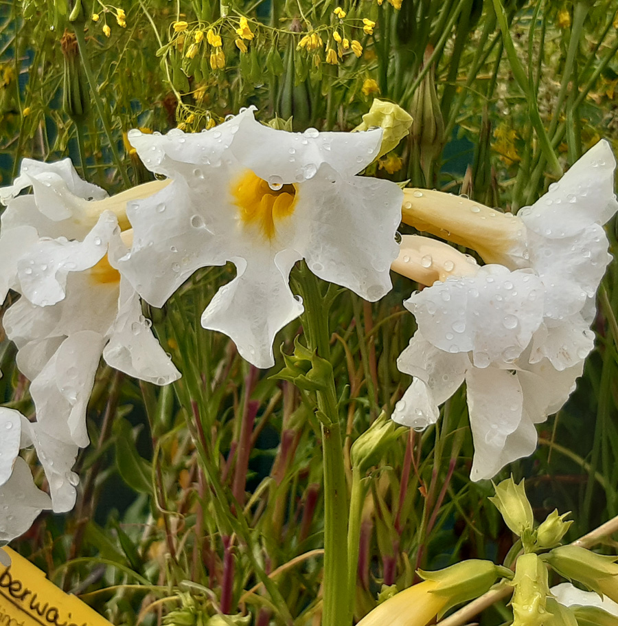 selten angebotene Staude mit sehr auffälligen, trompetenförmigen Blüten, zieht im Spätsommer ein, Blätter grob gelappt, für gut durchlässige, mäßig nährstoffreiche Böden