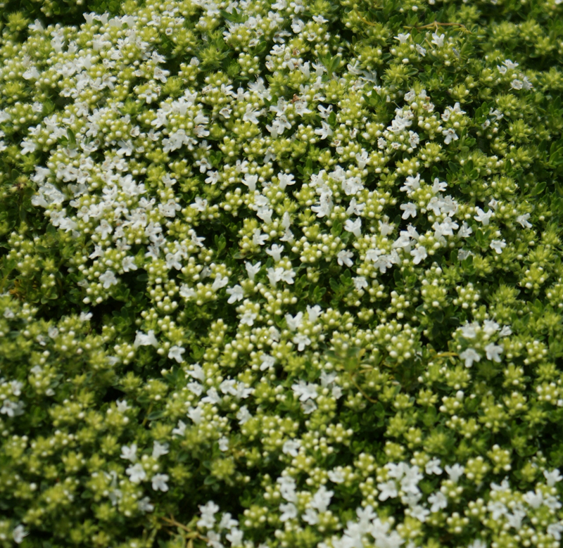 Thymus serpyllum Album ist die weiß blühende Form der heimischen Trockenrasenart. Die Auslese wächst etwas langsamer und bildet duftende, dichte und flache Polster. Geeignet für Mauern und durchlässige Böden. Gerne auch Sandböden.