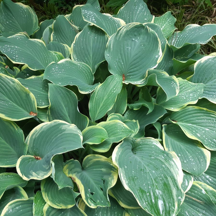Große Weißrand-Funkie mit festen, blaugrauen, spitz zulaufenden Blättern und gewelltem cremefarbenen Rand. Vasenförmiger Wuchs, bildet große, breite Horste, robuste und bewährte Sorte